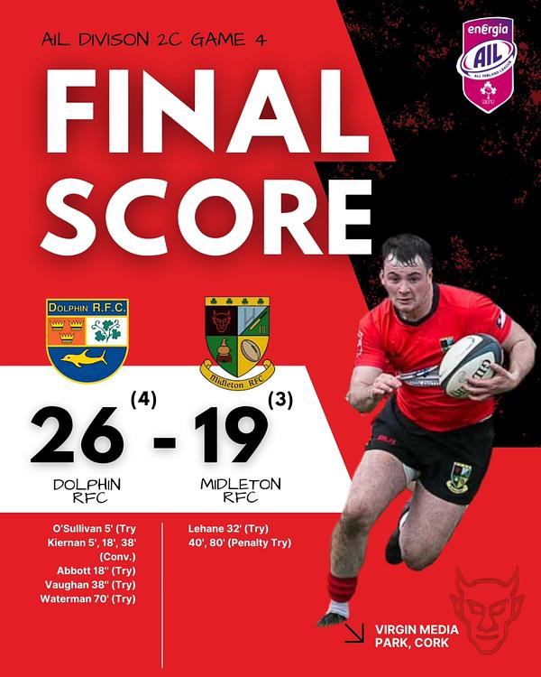 Midleton RFC produced a battling performance away to Dolphin RFC but were narrowly edged out 26β19 in a hard-fought AIL Division 2C clash at Virgin Media Park. Despite the result, the lads showed real determination to earn a valuable bonus point in the derby.