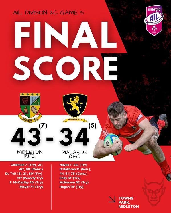 However, Midleton’s consistent forward pressure proved decisive, with JB adding his 3rd late on and Willie Meyer diving over for his first AIL try in the 71st minute to seal the win.